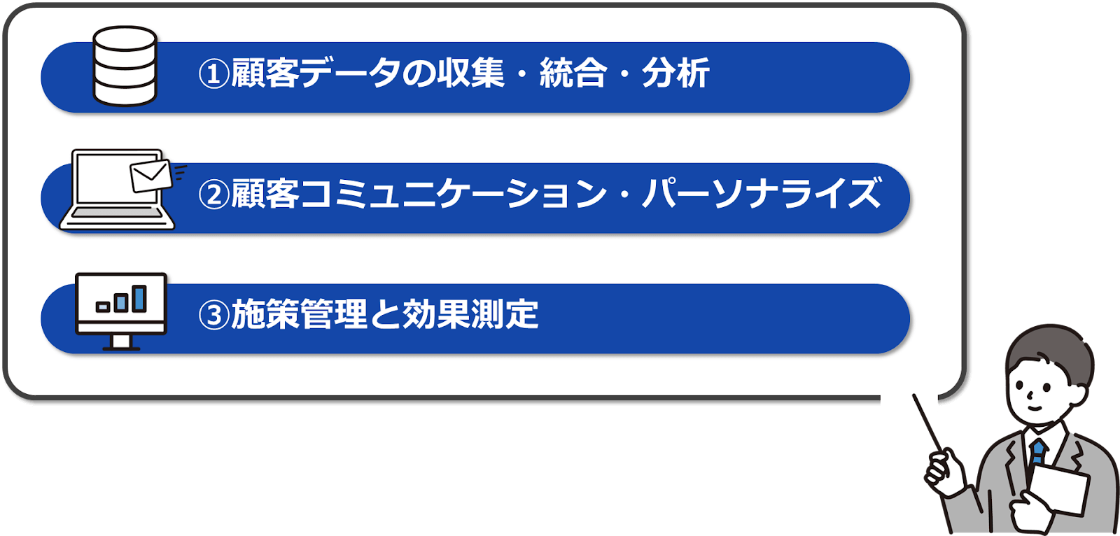 CRMの具体的な活動は、主に以下の3つに分けられます 。