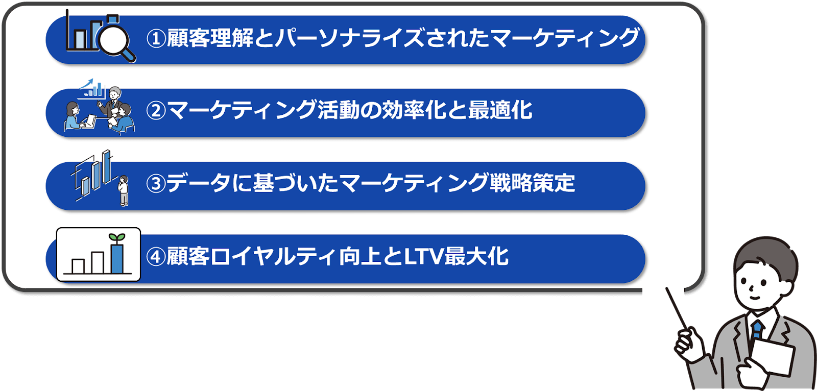 CRMを導入することで、以下の4つのことが実現できます 。