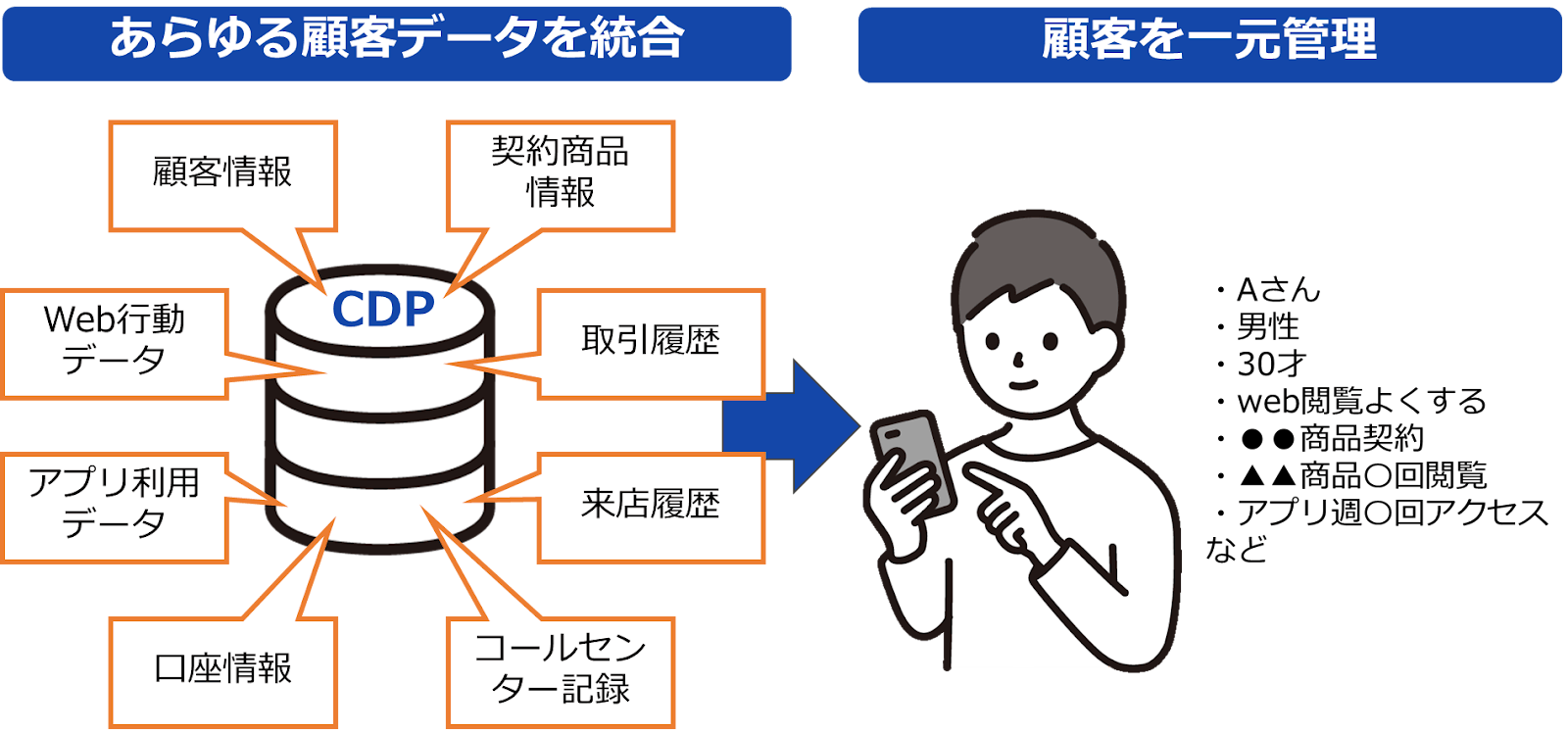 MAの限界を解消し 、より精度の高いマーケティングを実現するためには、CDPとの連携が必要です 。CDPで統合されたあらゆるデータ(顧客情報、Web行動データ、アプリ利用データ、取引履歴、来店履歴、コールセンター記録など) に基づき、MAで施策を実行することで、真のOne to Oneマーケティングが可能になります 。