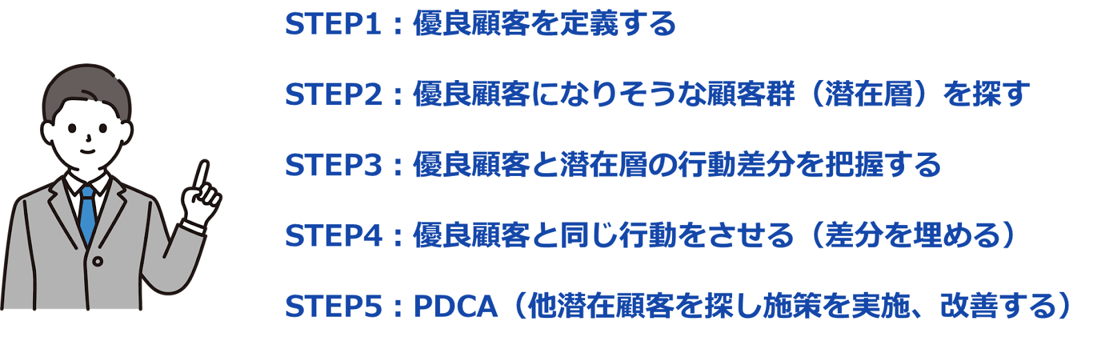 - ポイント3:データ活用を成功させるには、「優良顧客の定義」から「潜在層との行動差分の特定」、そして「差分を埋める施策の実行とPDCA」が重要である 。