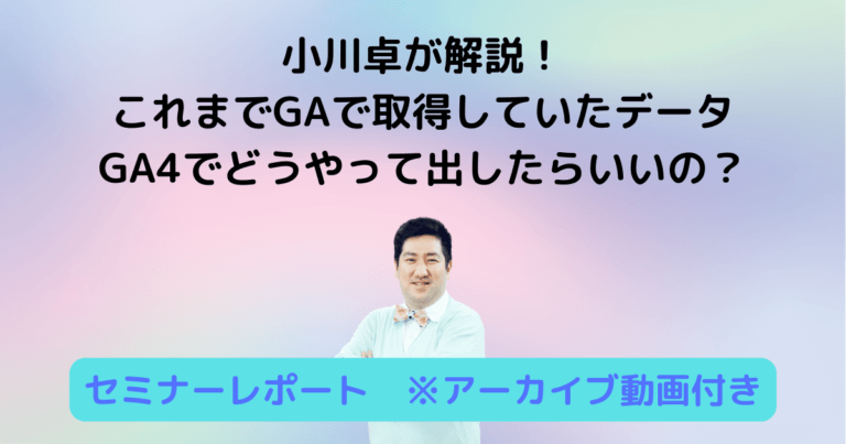 この記事では、 2022年5月18日に開催したWEBセミナー【小川卓が解説!|これまでGAで取得していたデータ、GA4で … 続きを読む 『小川卓が解説!』これまでGAで取得していたデータ、GA4でどうやって出したらいいの?~実際の画面で具体的に解説~|セミナーレポート