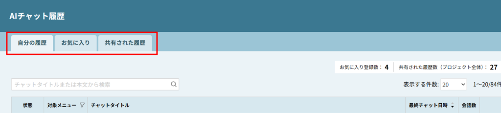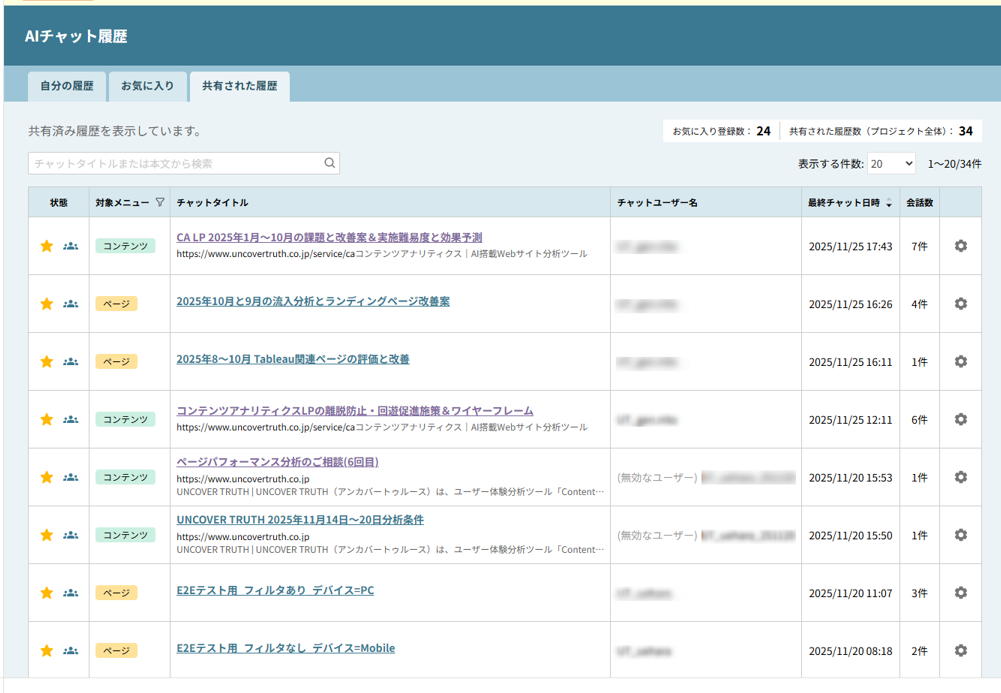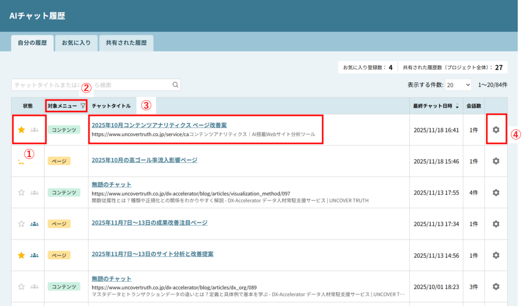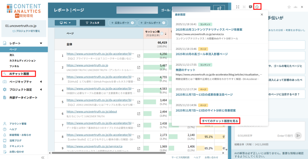 ページレポートやコンテンツレポートで利用したAIチャットの履歴を閲覧できる機能です。
