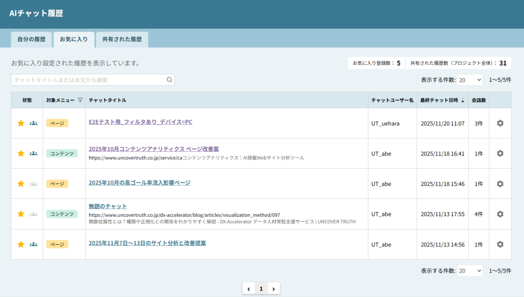 自分がお気に入り登録したチャットの履歴が一覧として表示されます。お気に入りの登録は、自身が作成したチャットだけでなく、他人が作成し、共有されたチャットも同じようにお気に入り登録することができます。