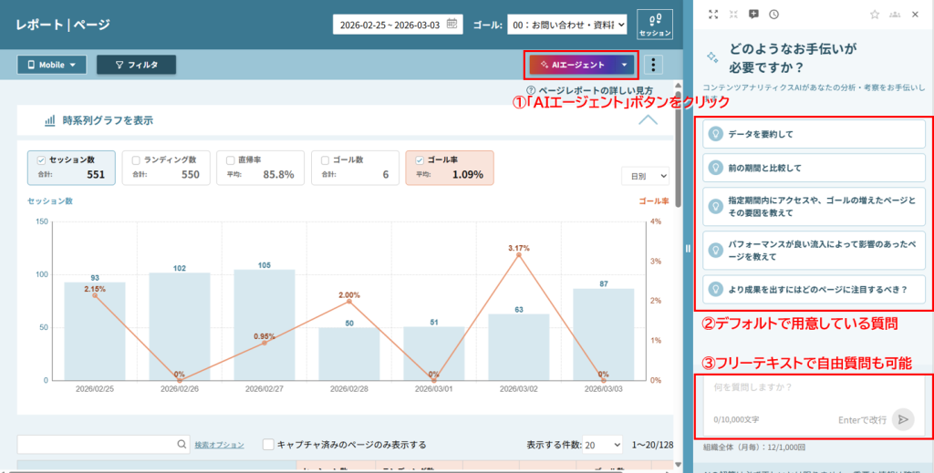 ページレポート画面の右上にあるをクリックすると、AIチャット機能のパネルが開かれます。