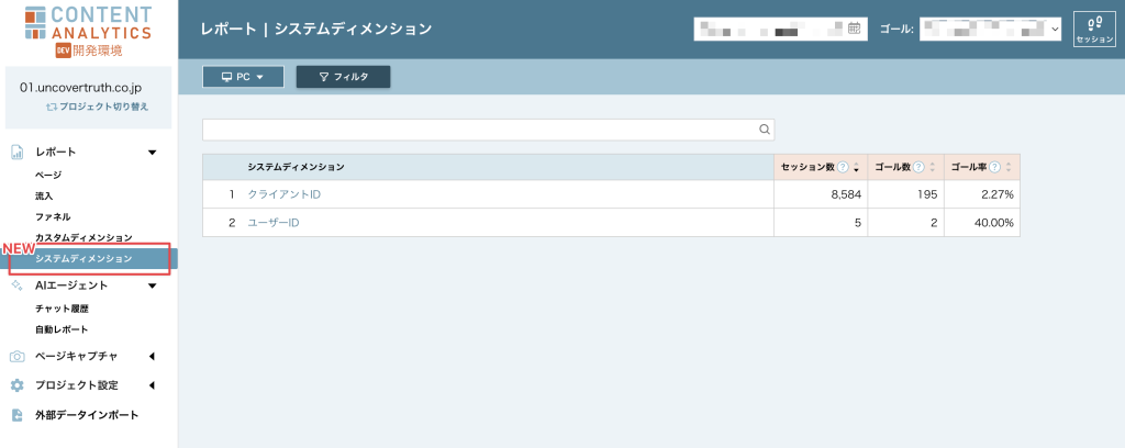 レポートメニューに「システムディメンション」を新設しました(左側メニュー内、カスタムディメンションの下に配置されています)。
